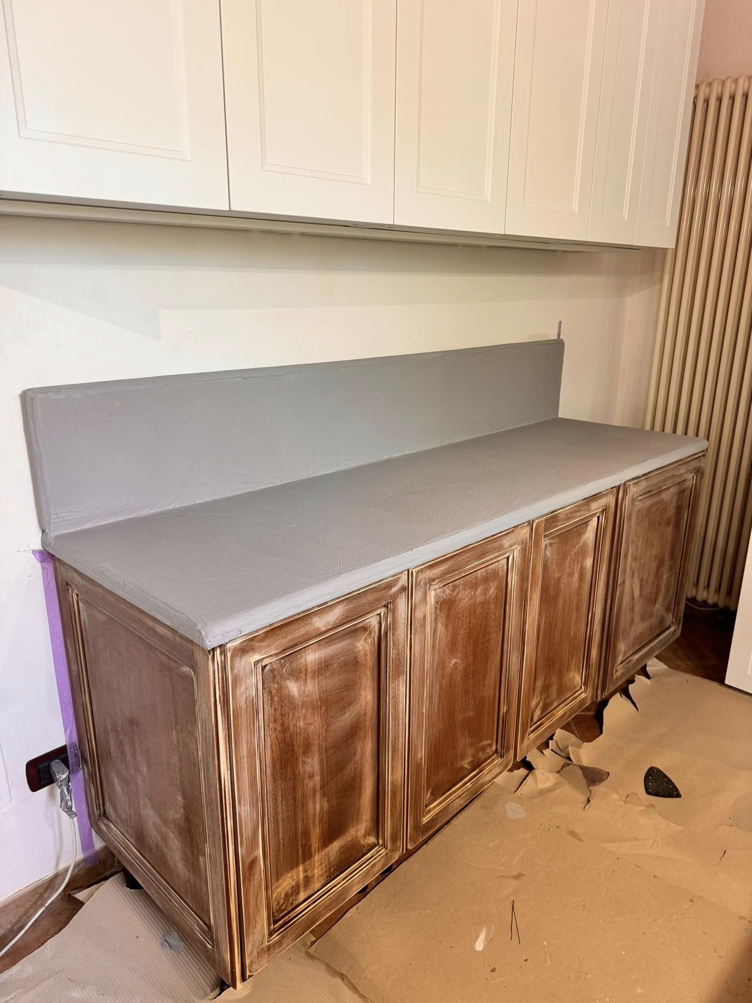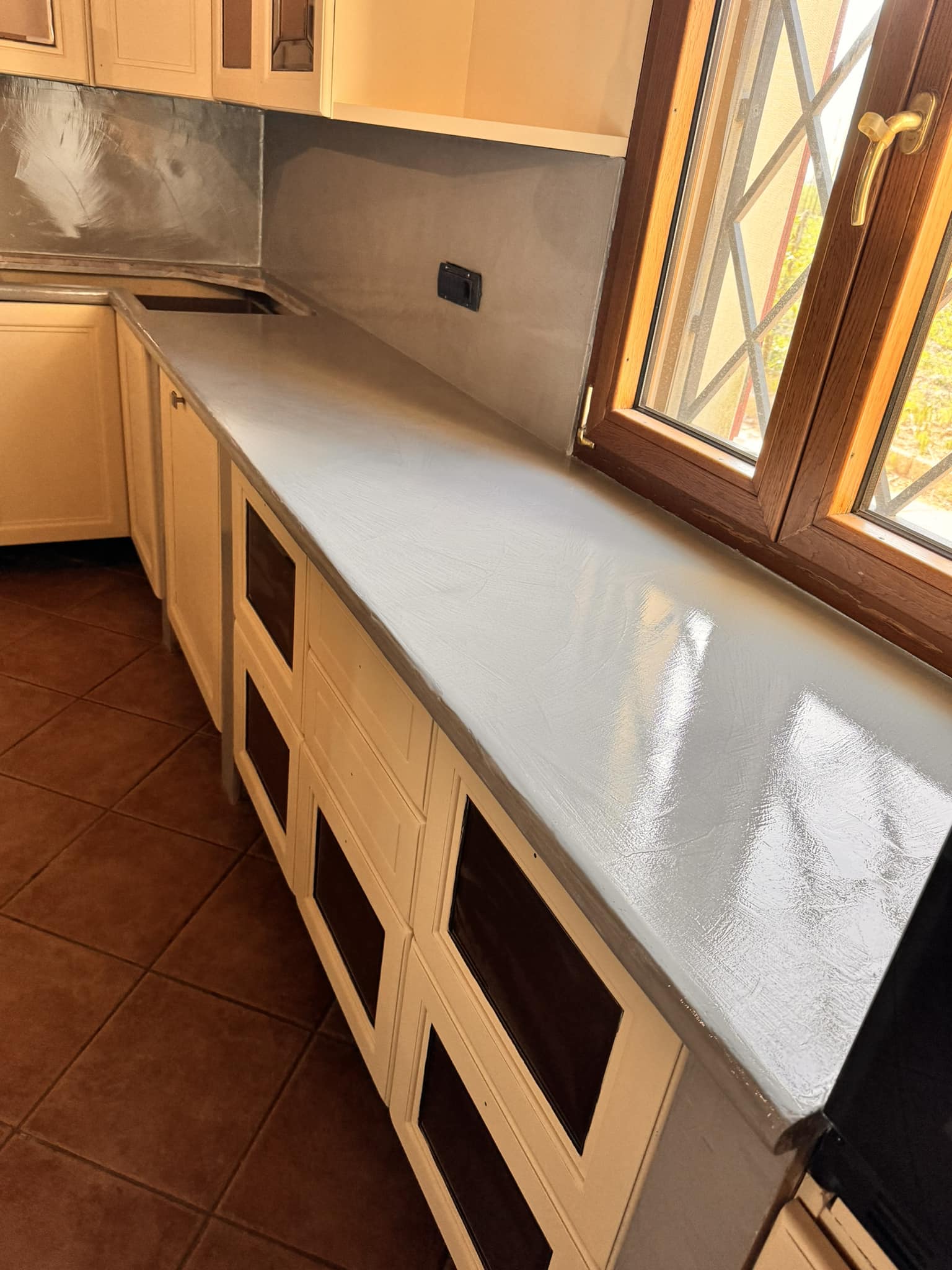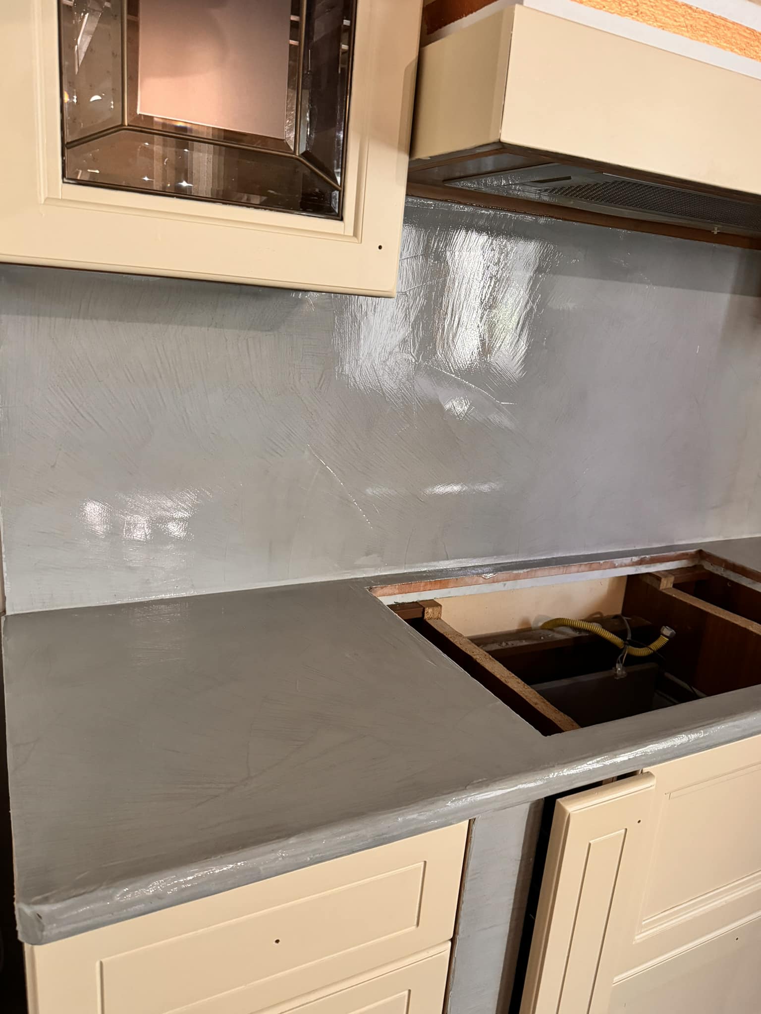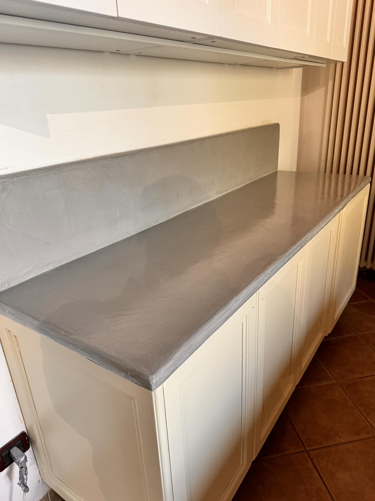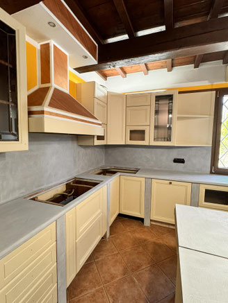 Restyling pareti cucina con resina effetto spatolato, spessore 3 millimetri, impermeabile ed ignifuga.