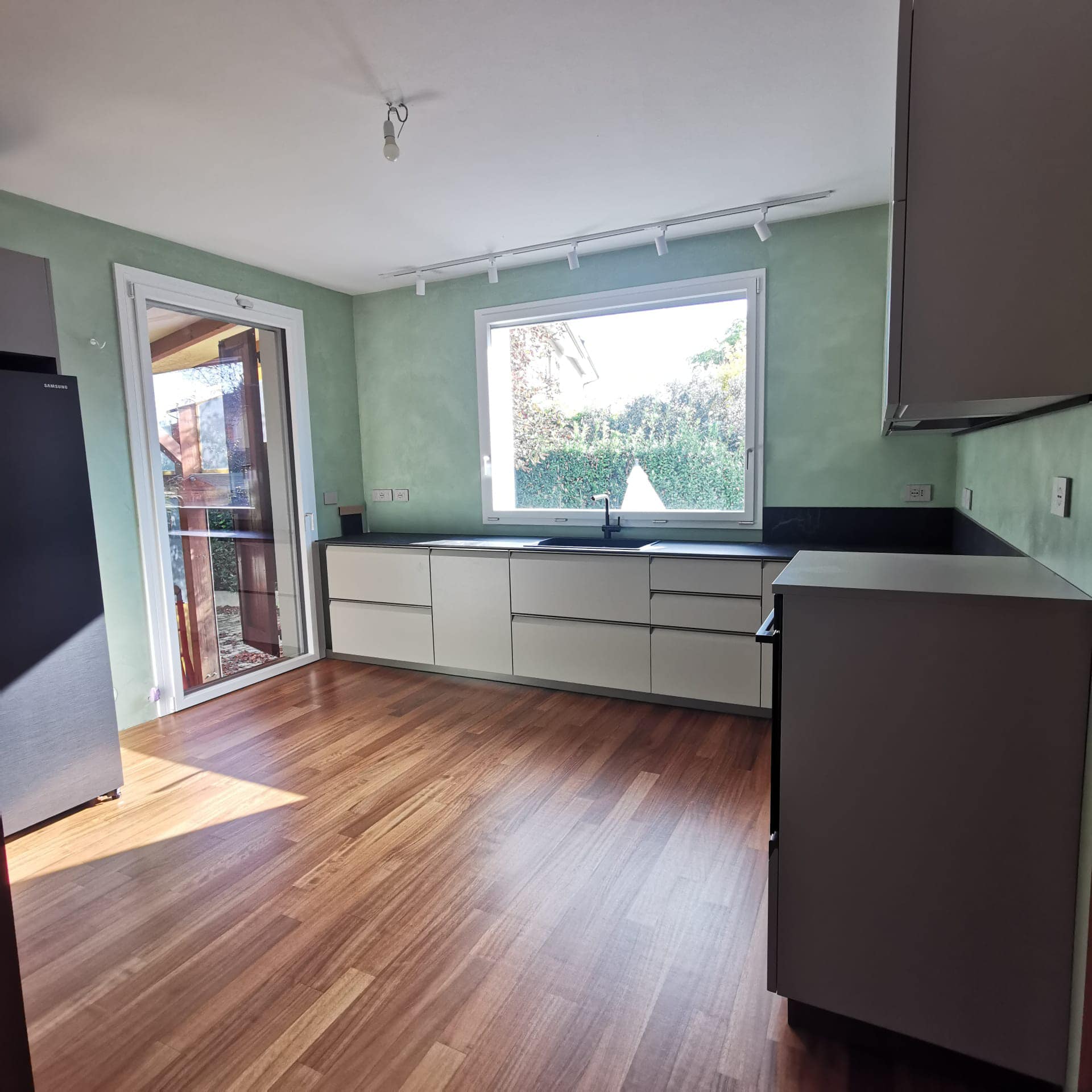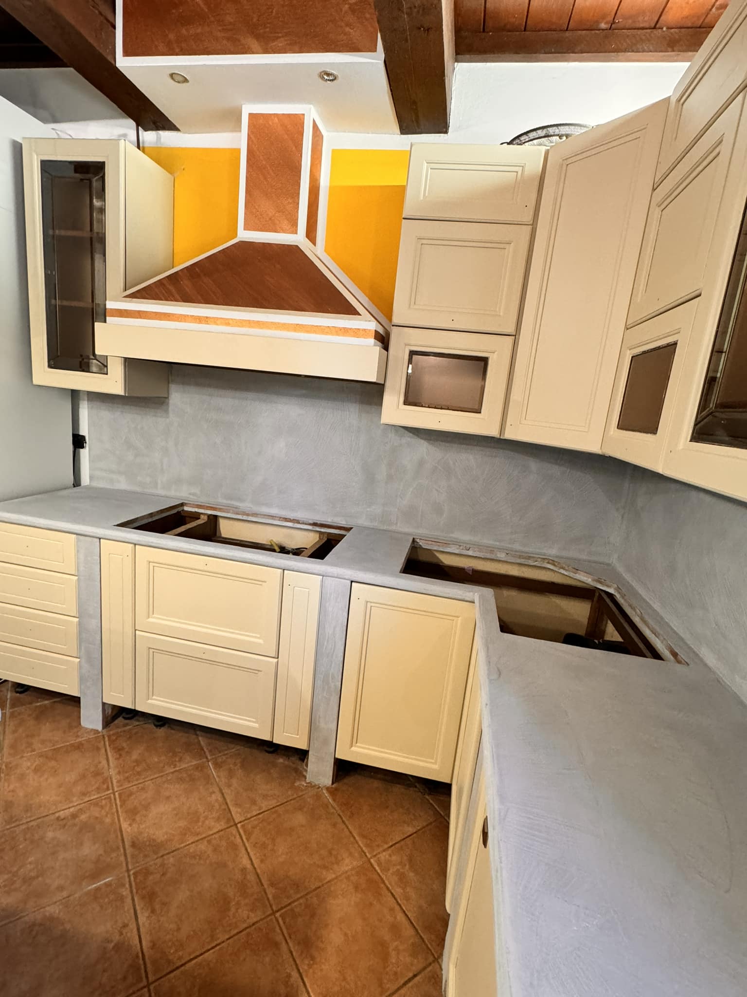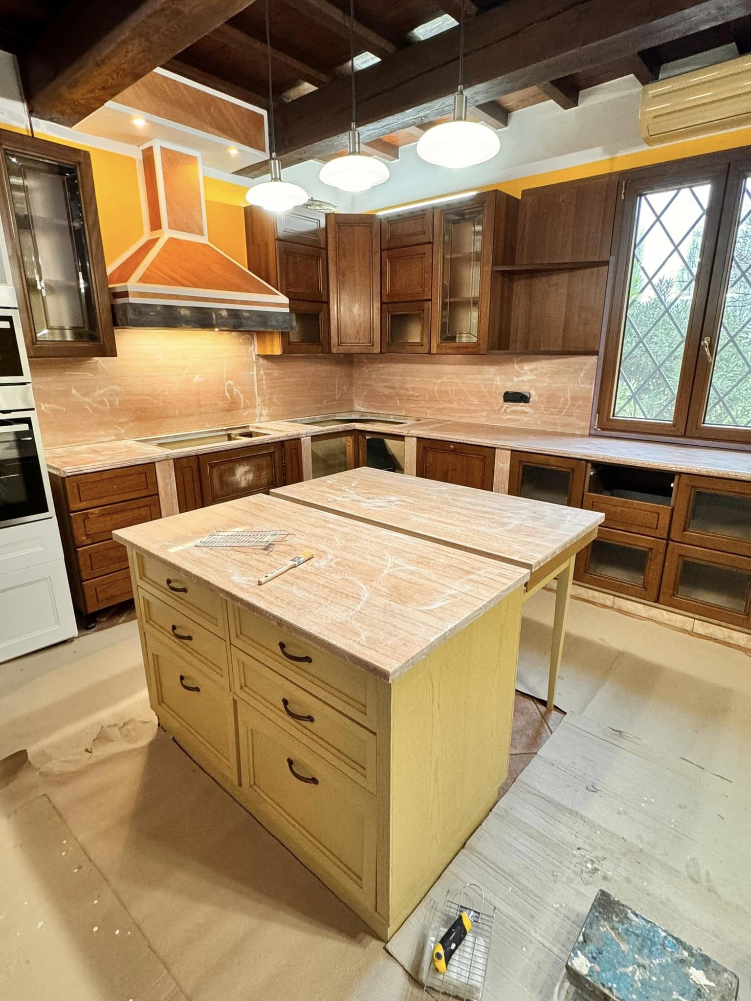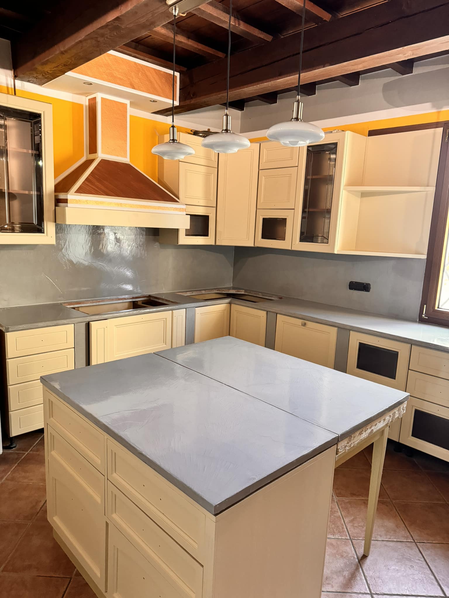 Restyling pareti cucina con resina effetto spatolato, spessore 3 millimetri, impermeabile ed ignifuga.