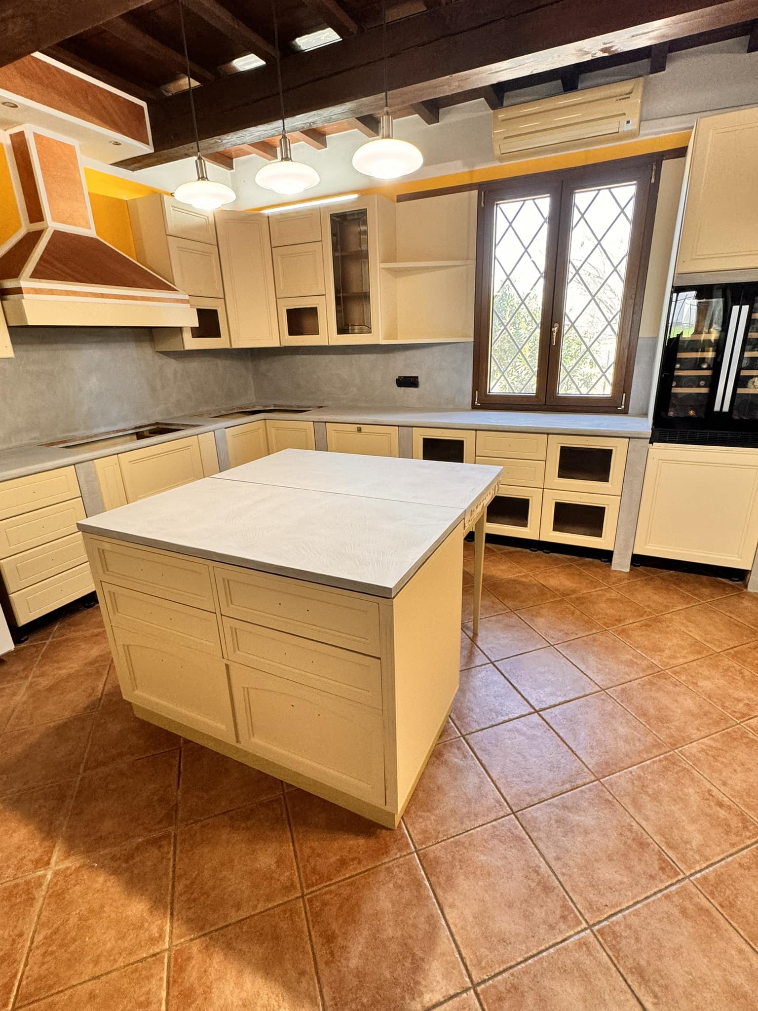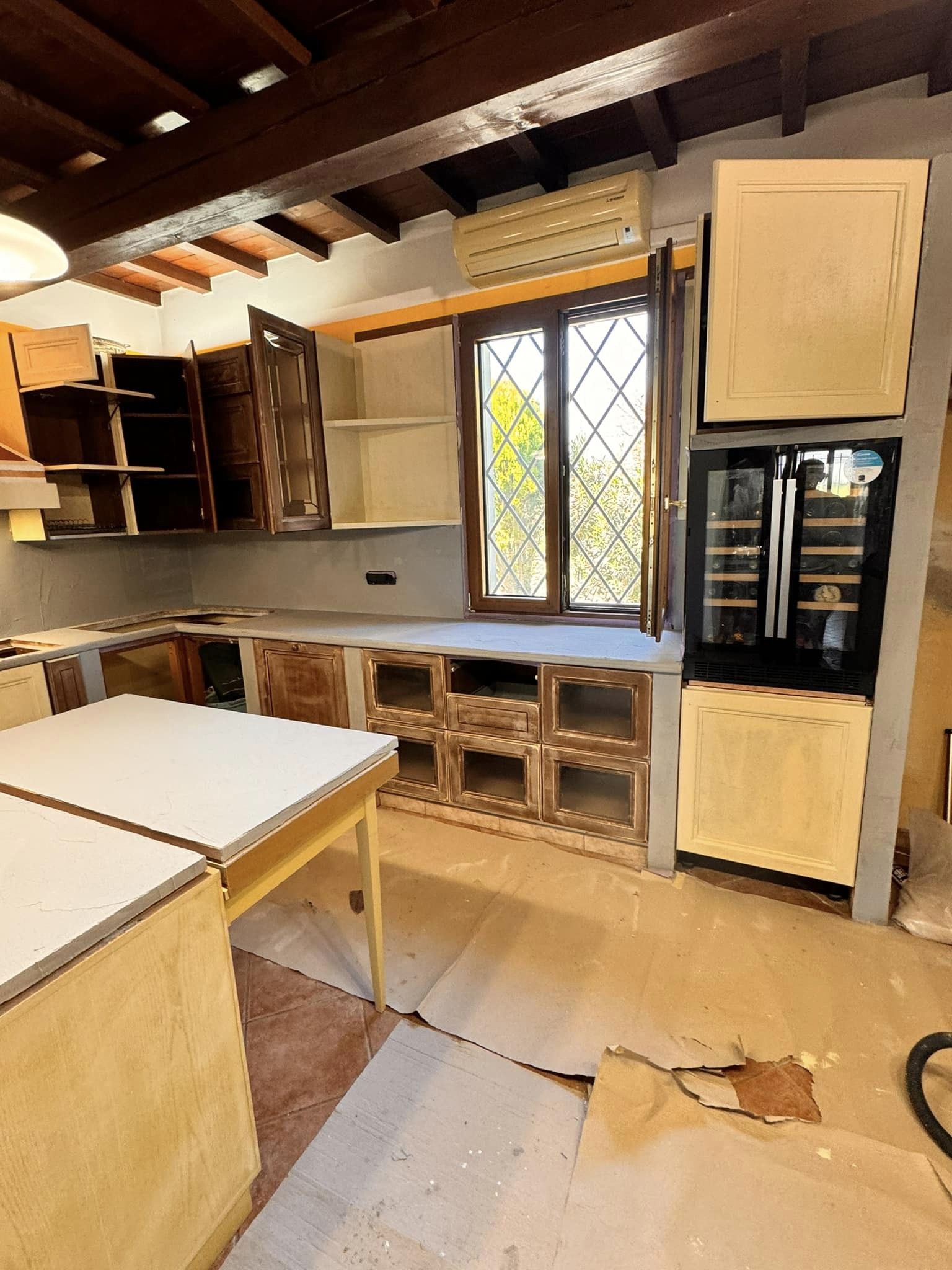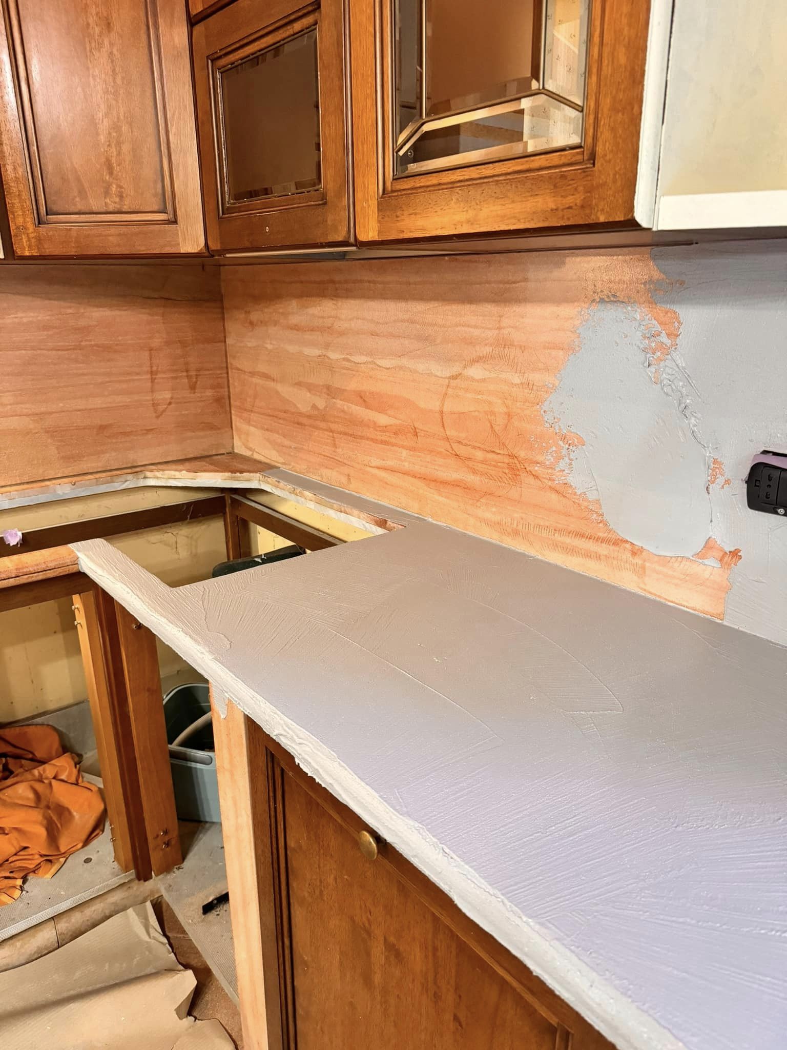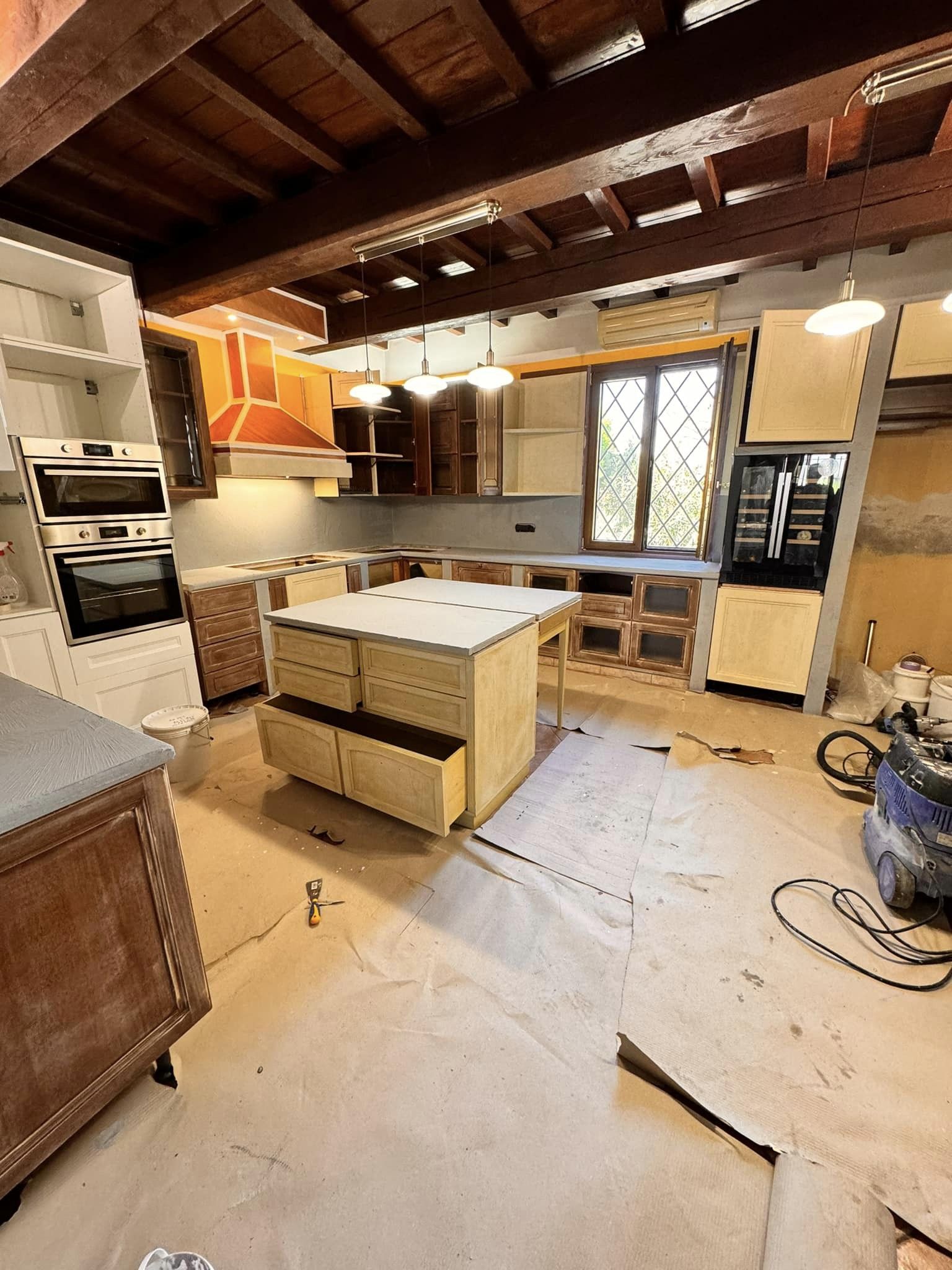 Restyling pareti cucina con resina effetto spatolato, spessore 3 millimetri, impermeabile ed ignifuga.